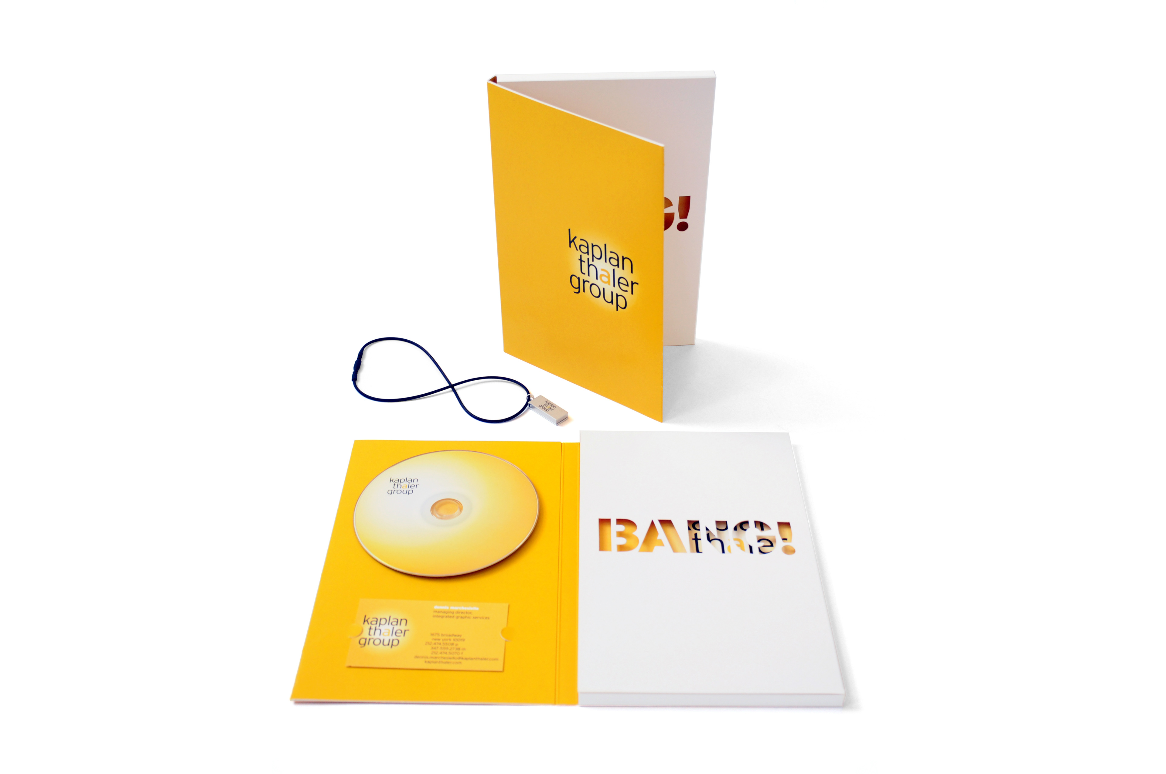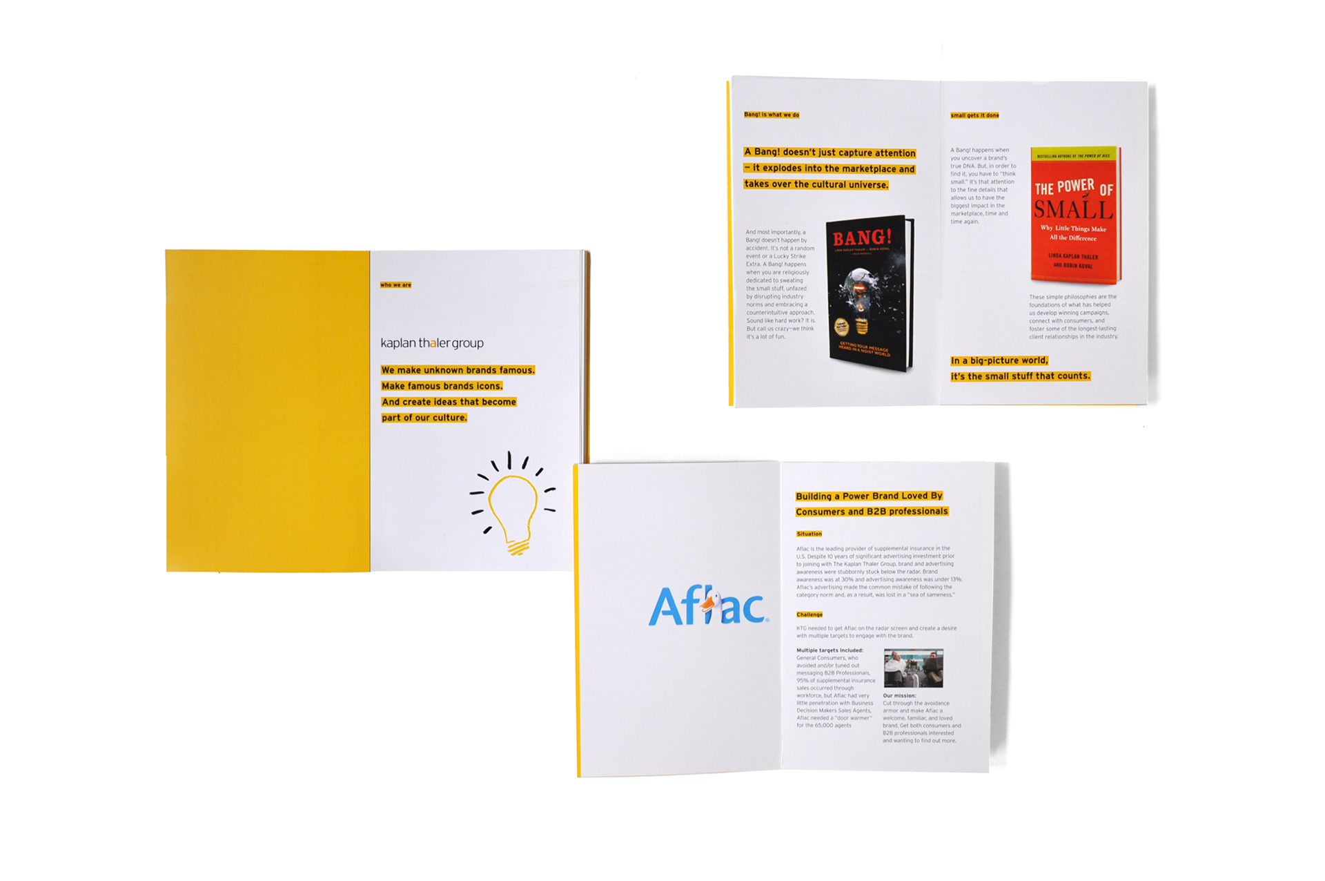 Kaplan Thaler Group is an advertising agency that specializes in witty, offbeat commercials; most famously known for creating the Aflac duck, and creating the book titled "Bang!" "Getting your message heard in a noisy world." The agency prides itself on coming up with clever/memorable ideas and took ownership over the "idea lightbulb" as part of their identity. When we started rebranding them, we wanted to show that ideation process coming to fruition in the logo. To achieve this, a gradient was placed behind the typography, to symbolize that a light has been turned on and an idea has formed.